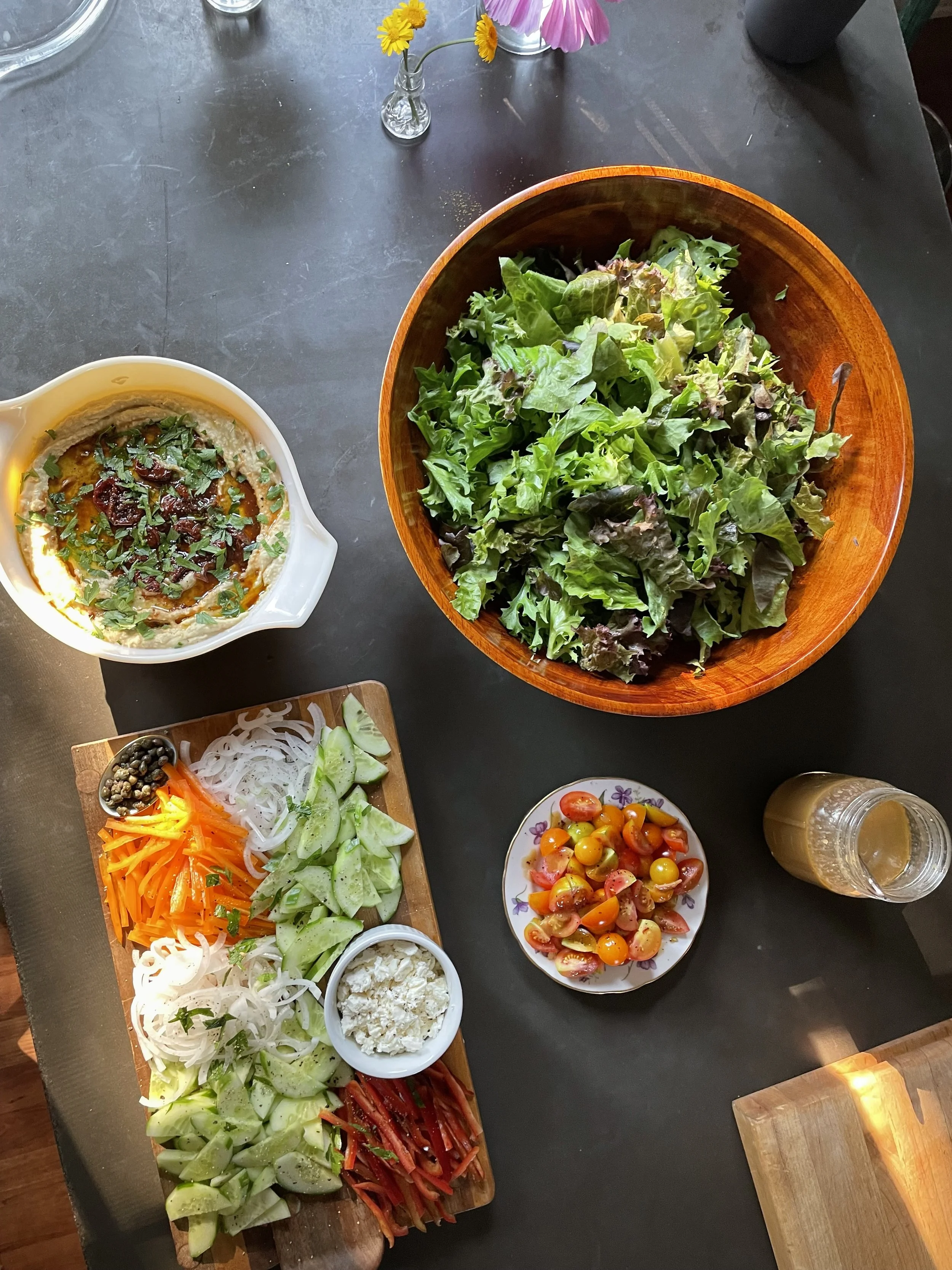Salad, but deconstructed to look fancier. And hummus for a no cook dinner when its your night to cook but the house is 88 degrees. Also with peach vinaigrette with peaches from our orchard :)